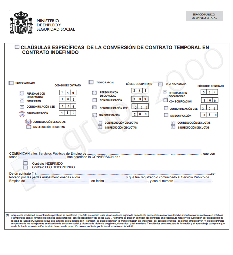 Hay que recordar que la Ley 3/2012 establece que se trata de una reducción, y por eso, el SEPE, que sí distingue entre bonificación y reducción, obliga a comunicar la transformación con los códigos 189, 289, 389. A continuación os mostramos la página 21 del modelo oficial de transformación en contrato indefinido del SEPE, donde habrá que marcar el código de contrato que corresponda (en función del tipo de jornada).